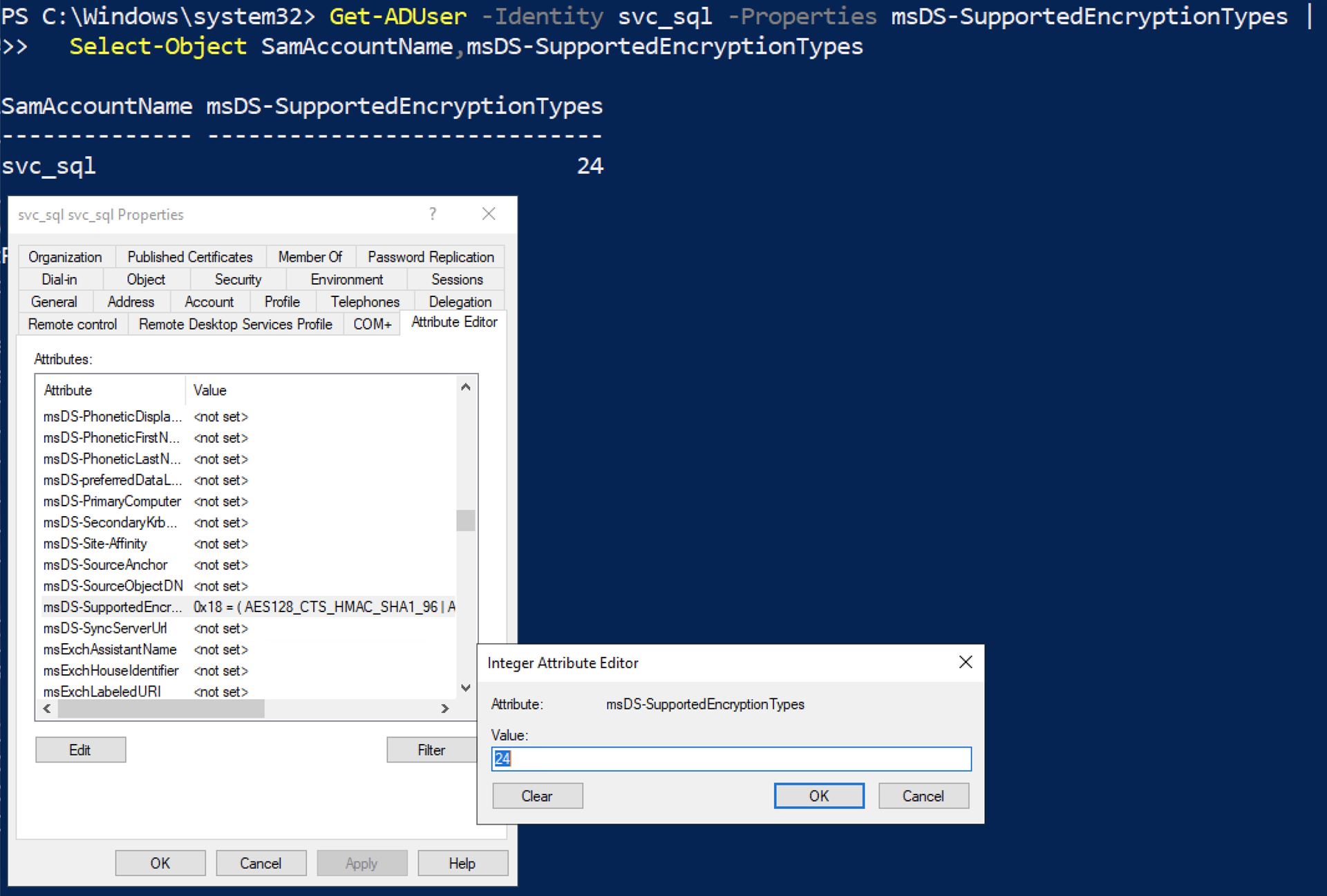 An etype (encryption type) defines which crypto profile protects a ticket. In AD, etype is not only a crypto choice; it’s also a configuration and detection signal (baseline vs deviation). Microsoft defines msDS-SupportedEncryptionTypes as describing the etypes supported by user/computer/trust accounts and notes KDC uses this when generating service tickets.